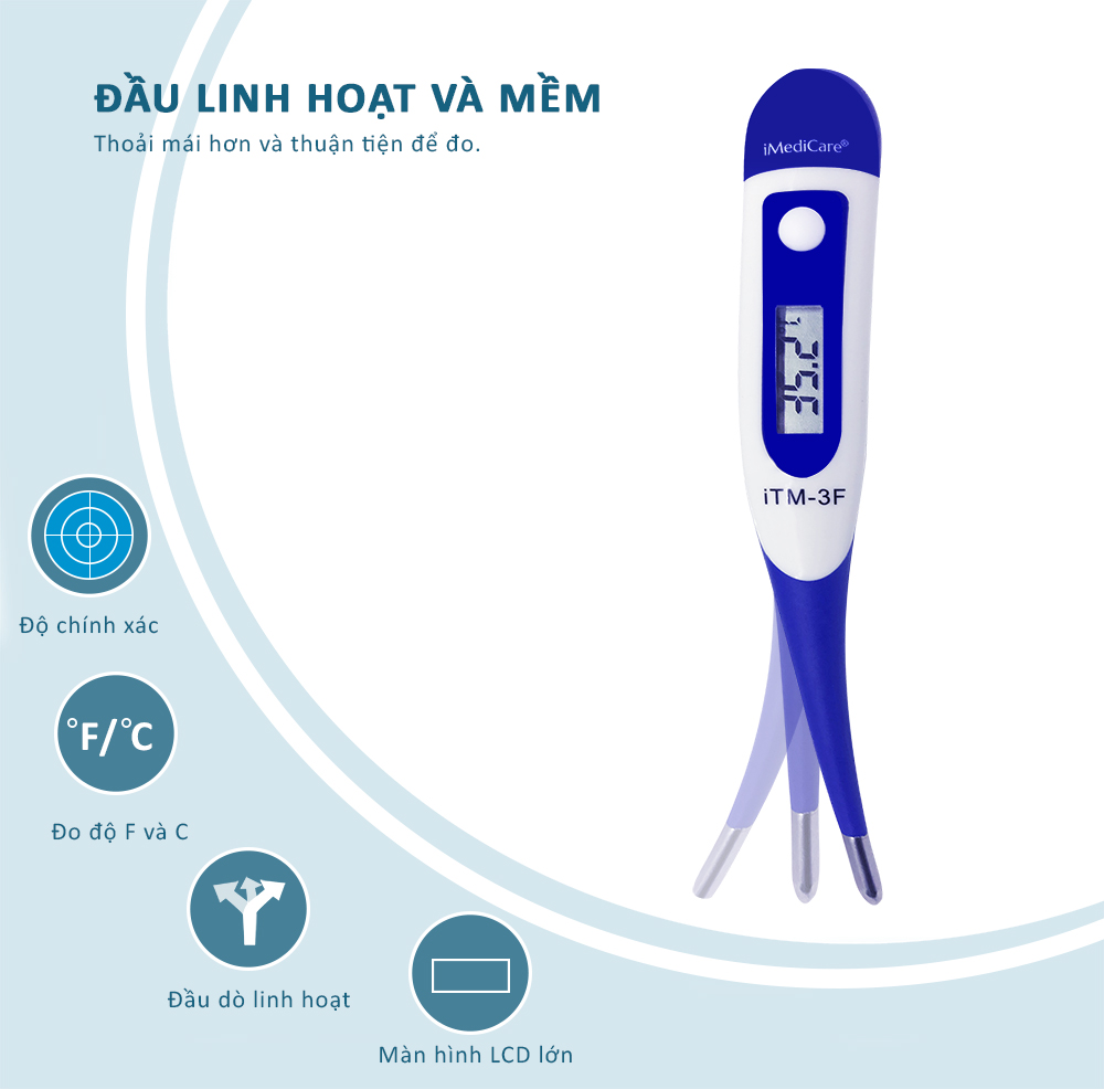 Sản phẩm Nhiệt kế điện tử đầu mềm iMediCare iTM-3F là được sản xuất bằng công nghệ tiên tiến theo tiêu chuẩn Châu Âu. Đây là dòng nhiệt kế đầu đo mềm, dễ sử dụng, tốc độ đo siêu nhanh với độ chính xác cao, giá thành rẻ.